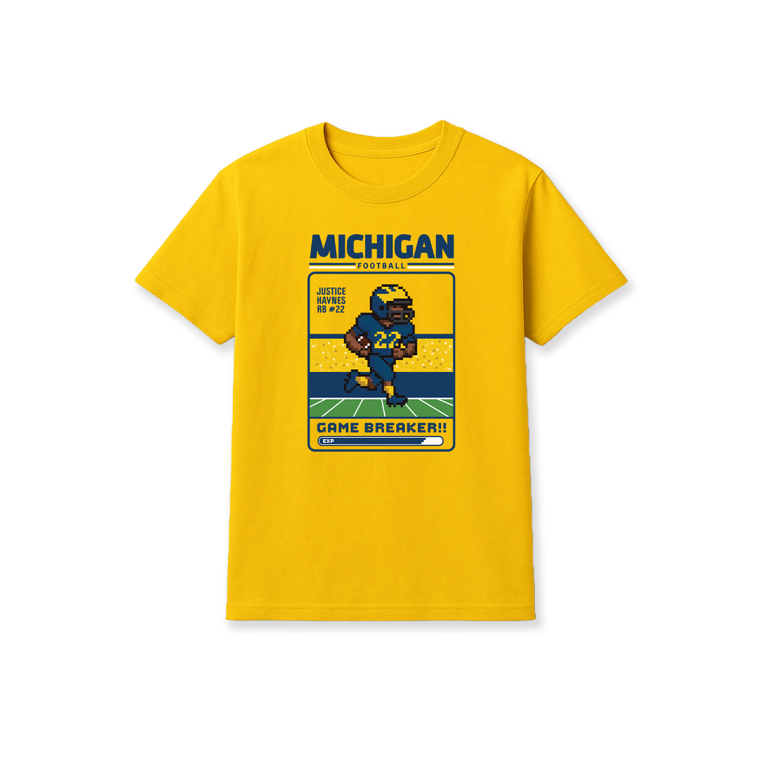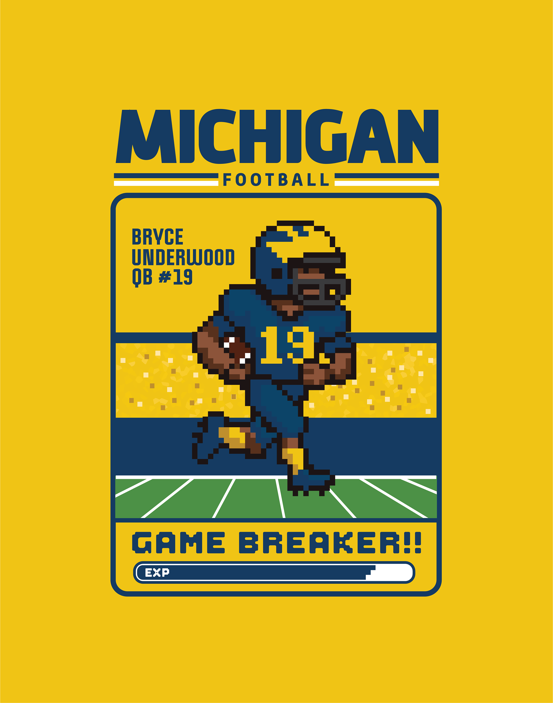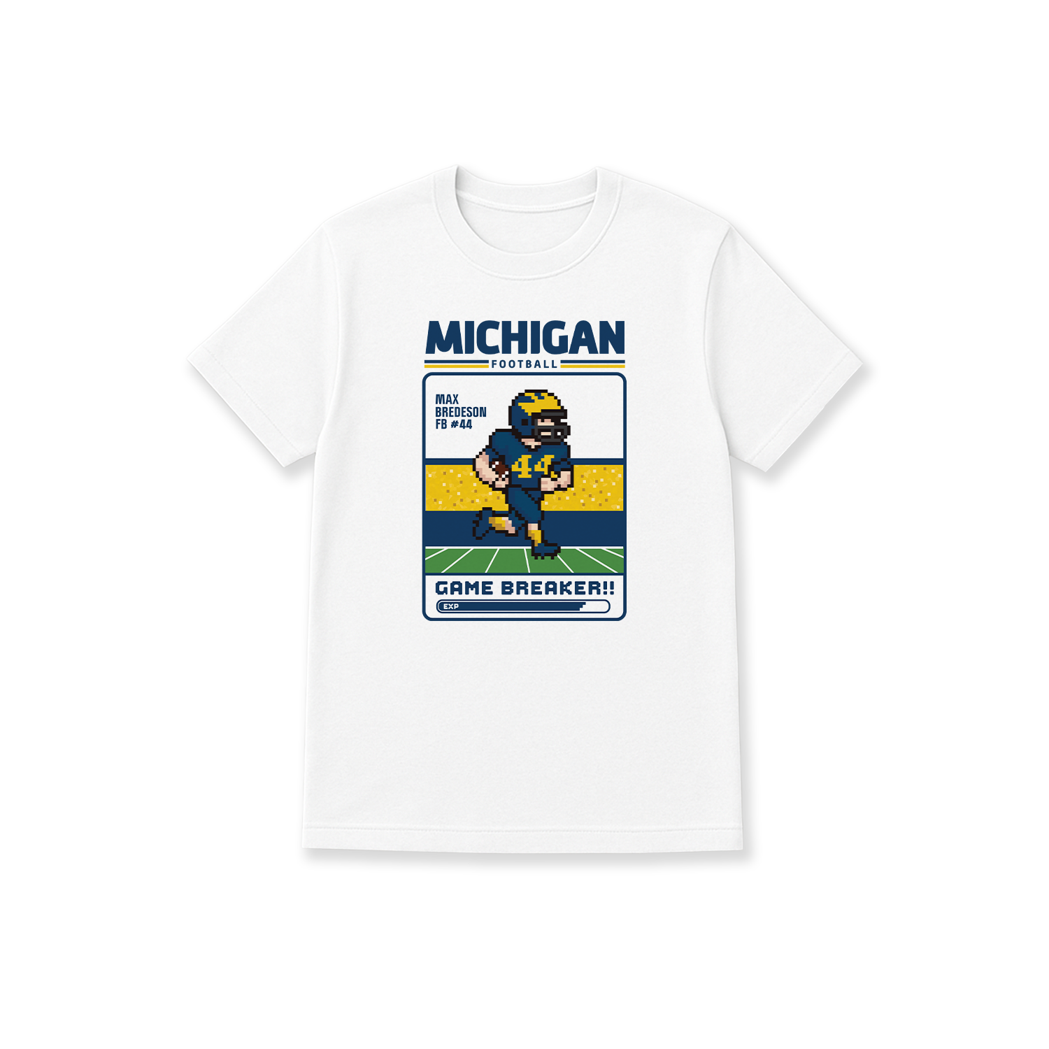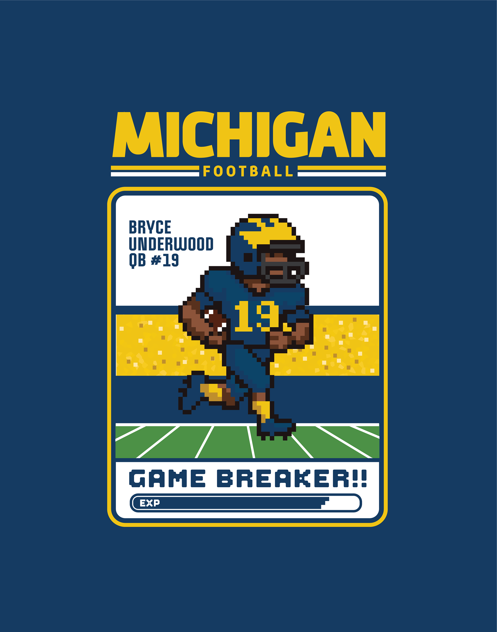 The "Game Breaker!!" series was a collection of graphic tees made for specific players on the University of Michigan men's football and basketball teams during the 2025 season. They are based on the 8-bit graphics from popular video games in the 80's and 90's, and elements from popular arcade games.