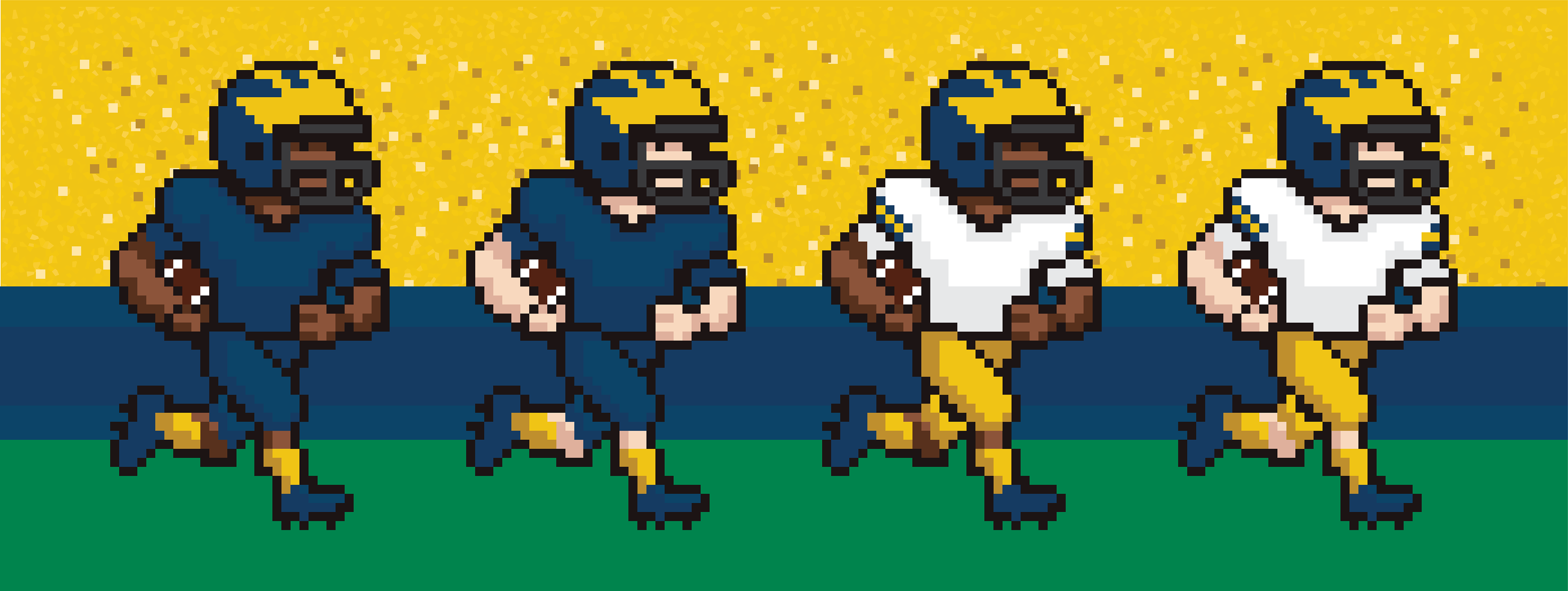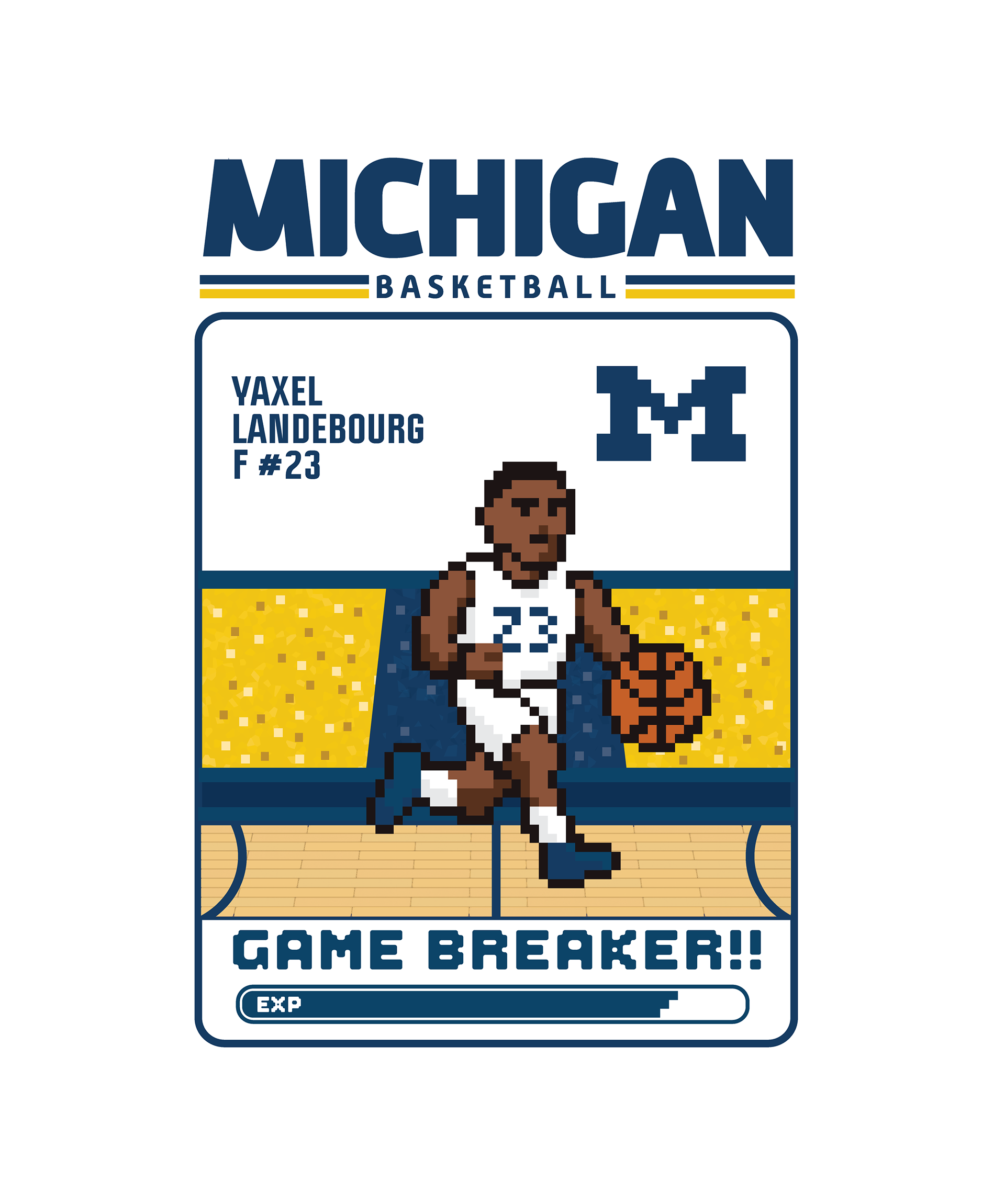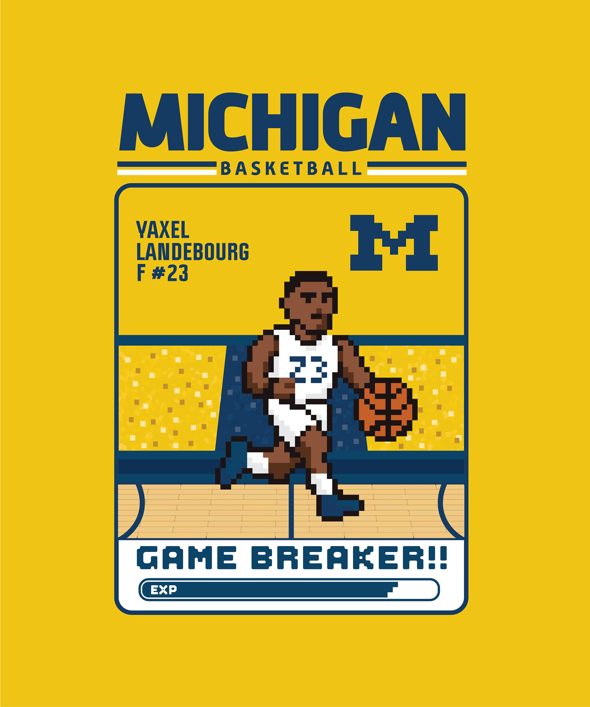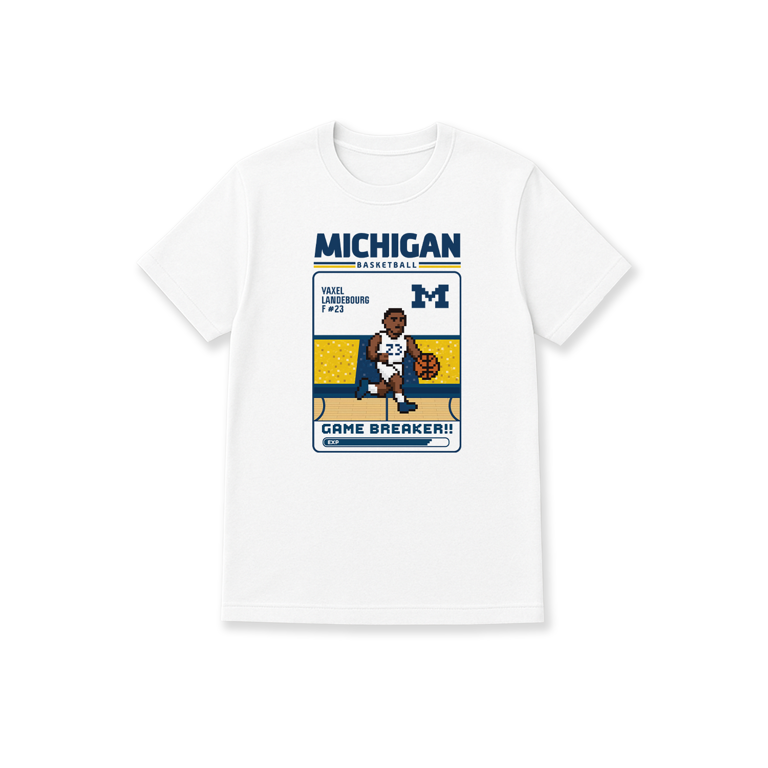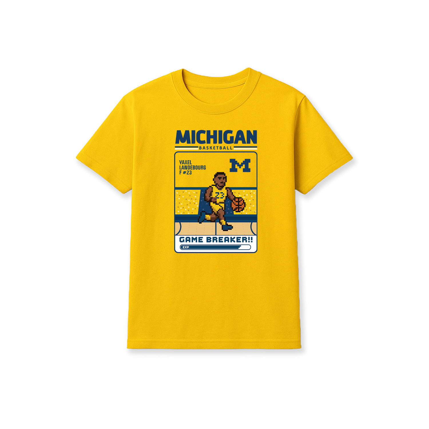 The "Game Breaker!!" series was a collection of graphic tees made for specific players on the University of Michigan men's football and basketball teams during the 2025 season. They are based on the 8-bit graphics from popular video games in the 80's and 90's, and elements from popular arcade games.