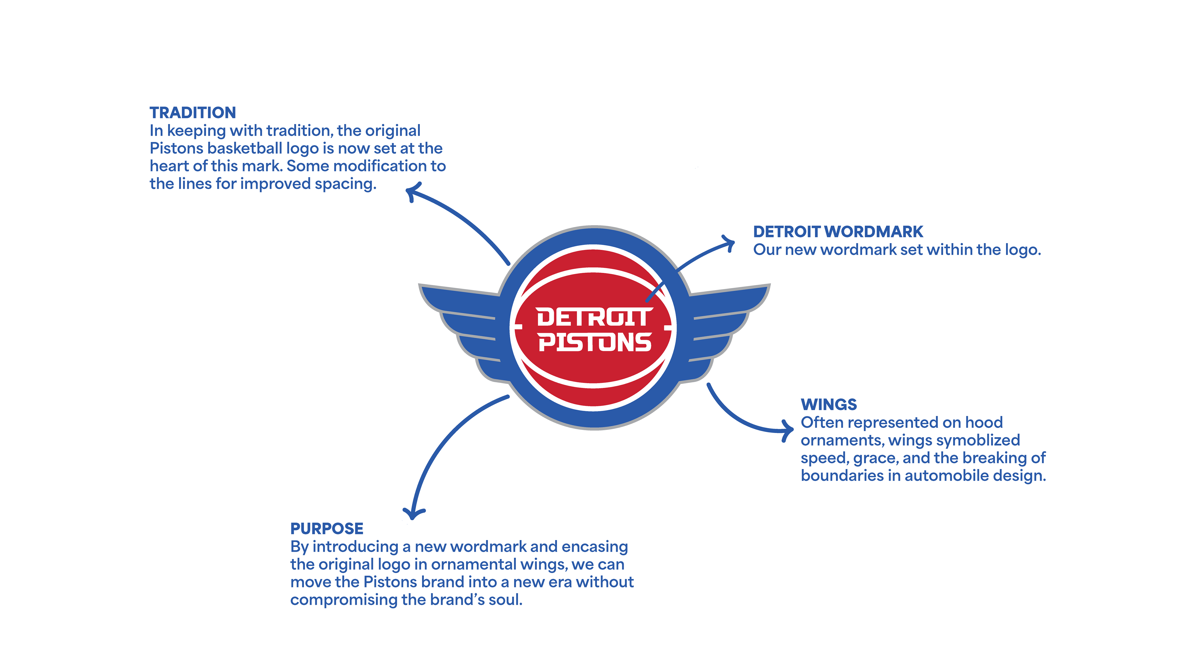 The Result: The final identity system evolves the Detroit Pistons from a static "basketball-in-a-circle" to an instantly recognizable industrial badge that adopts the speed wing architecture of some of the world’s most iconic automotive brands. This evolution grounds the team in the mechanical and industrial prowess of the Motor City, while the wings serve as a constant reminder of humanities greatest achievement - the engine’s ability to conquer the skies - and a signal to our hometown team that with grit and determination, anything is possible.