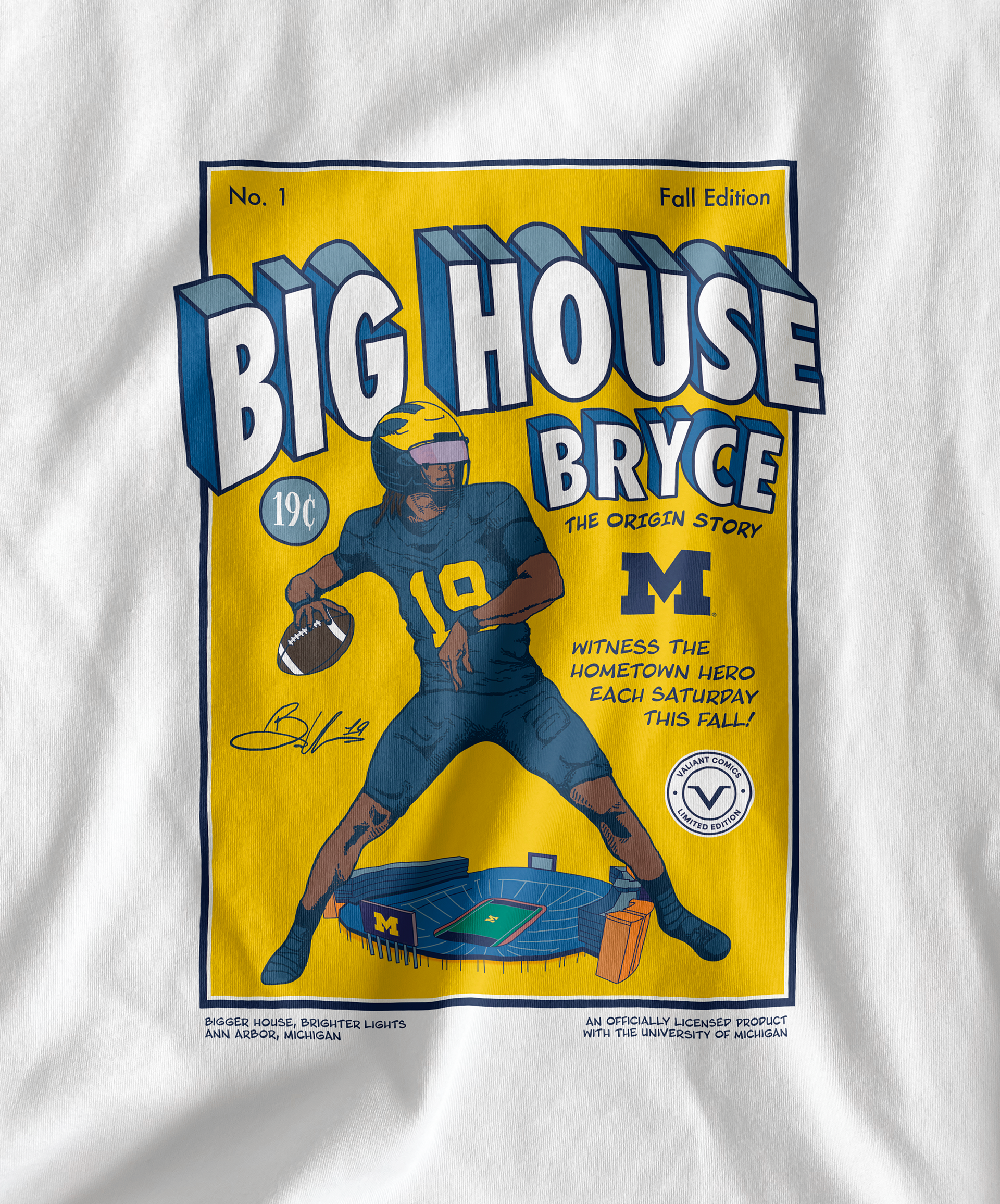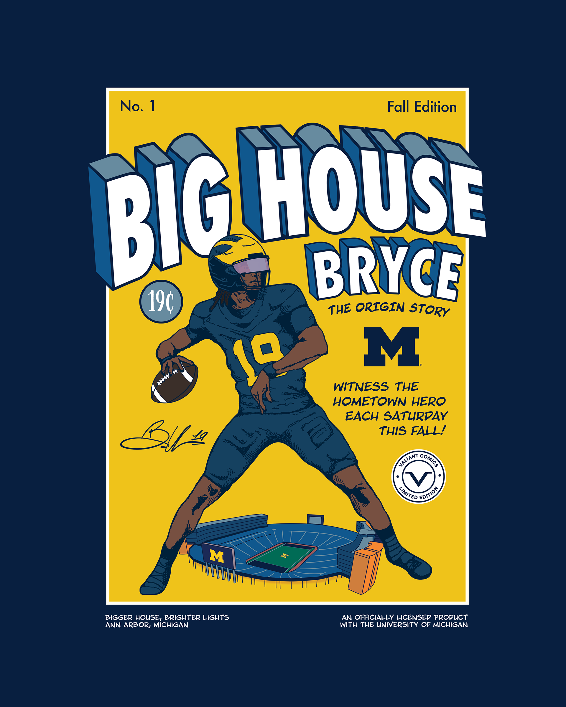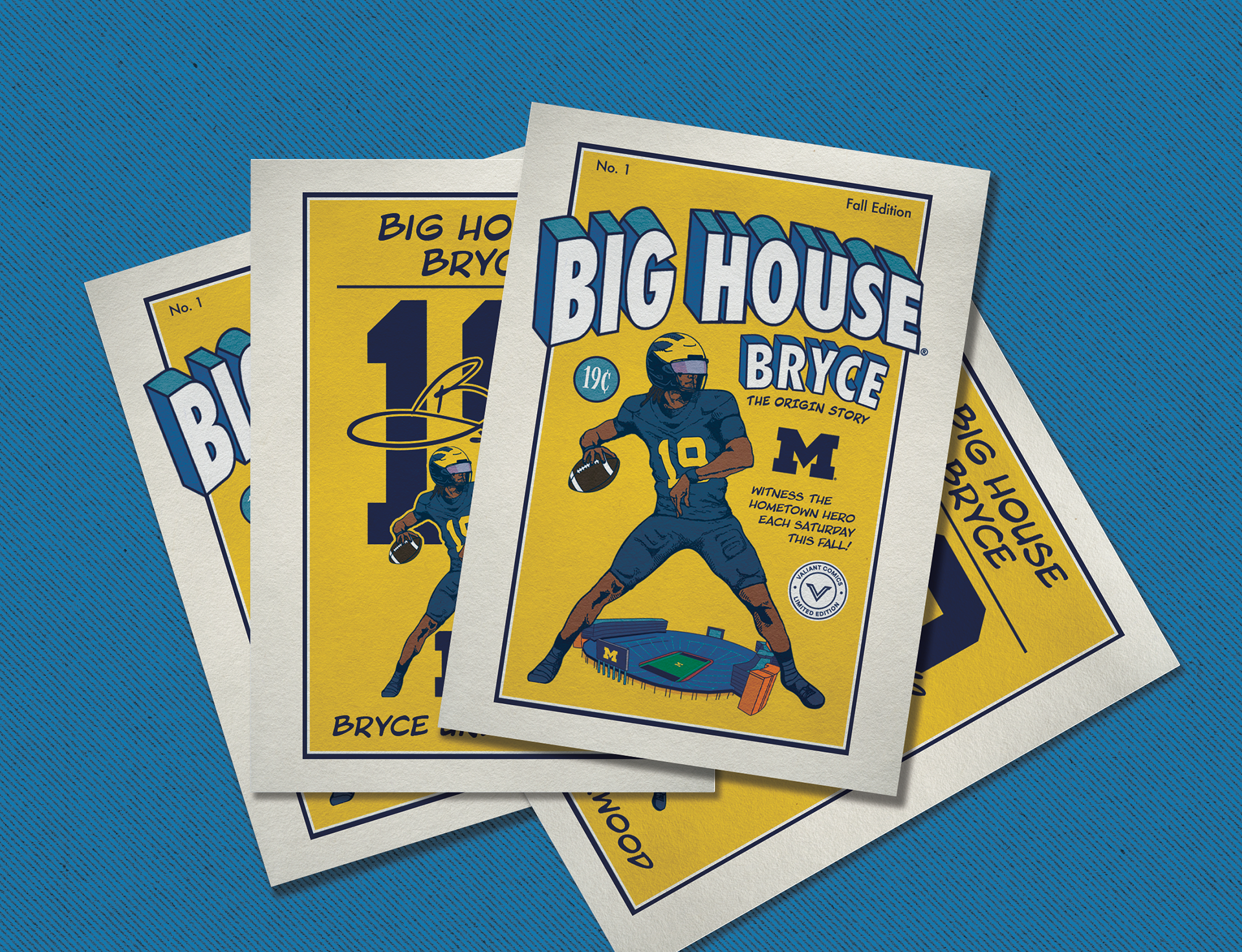 This comic book inspired design was created on behalf of Valiant for Michigan Quarterback Bryce Underwood and was used on t-shirts and trading cards during the 2025 Michigan Football season.